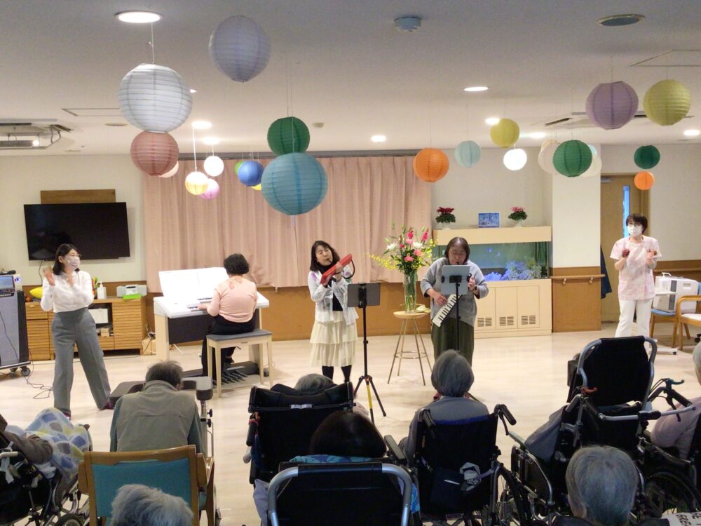 光が丘・介護職員の濱谷です。 先日、エレクトーンと鍵盤ハーモニカの演奏会が開催されました。 ボランティアの方々に加え田口ホーム長も、エレクトーンで「♪マツケンサンバⅡ」を披露しました。 なじみのある曲はどこからともなく歌声が聞こえ、皆で一緒に作り上げた温かい演奏会になりました。