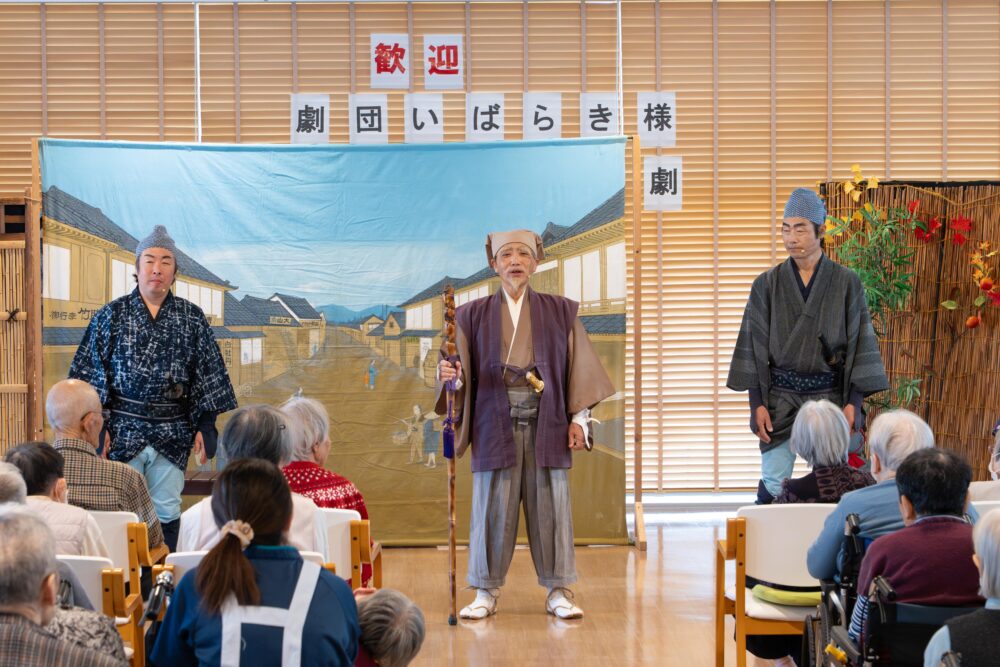 ホーム長の木村です。 先日「劇団いばらき」様による演劇「水戸黄門」を当ホームにて観劇しました。 ボランティアの方々によるものですが、プロ顔負けの舞台と演技力に入居者様も釘付けでした。 演劇終了後には、劇団の方と入居者様との写真撮影もあり、大変楽しい一日となりました。
