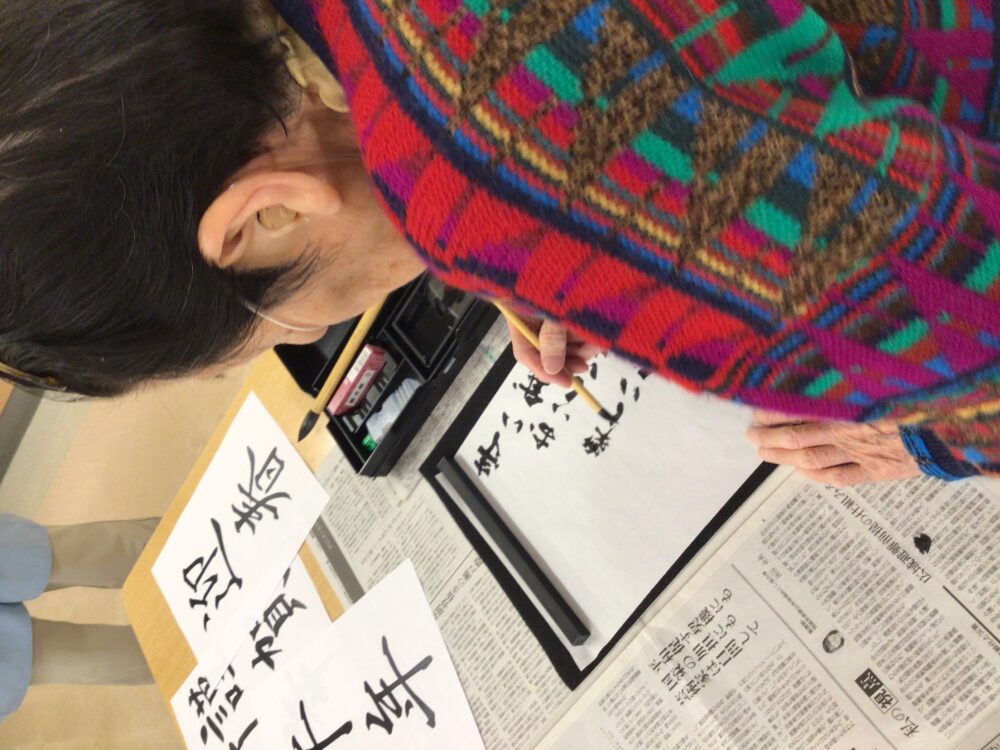 介護主任の小山です。 元日に新年の書初めを行いました。 書初めは久しぶりという方が多く、「うまく書けないわ」「こんなに難しかったかなぁ?」と、皆さま一心不乱に筆を動かされ、納得のいく一枚を書き終えるまで熱心に取り組まれてました。